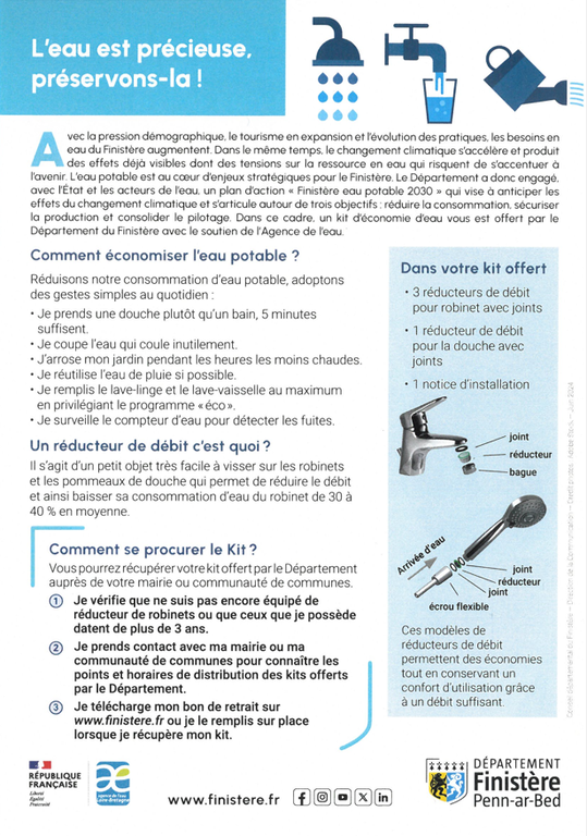 Le conseil départemental du Finistère distribue à chaque domicile un pack d'économie d'eau, composé de 3 mousseurs pour robinet et d'un mousseur pour douche, fournis avec des joints